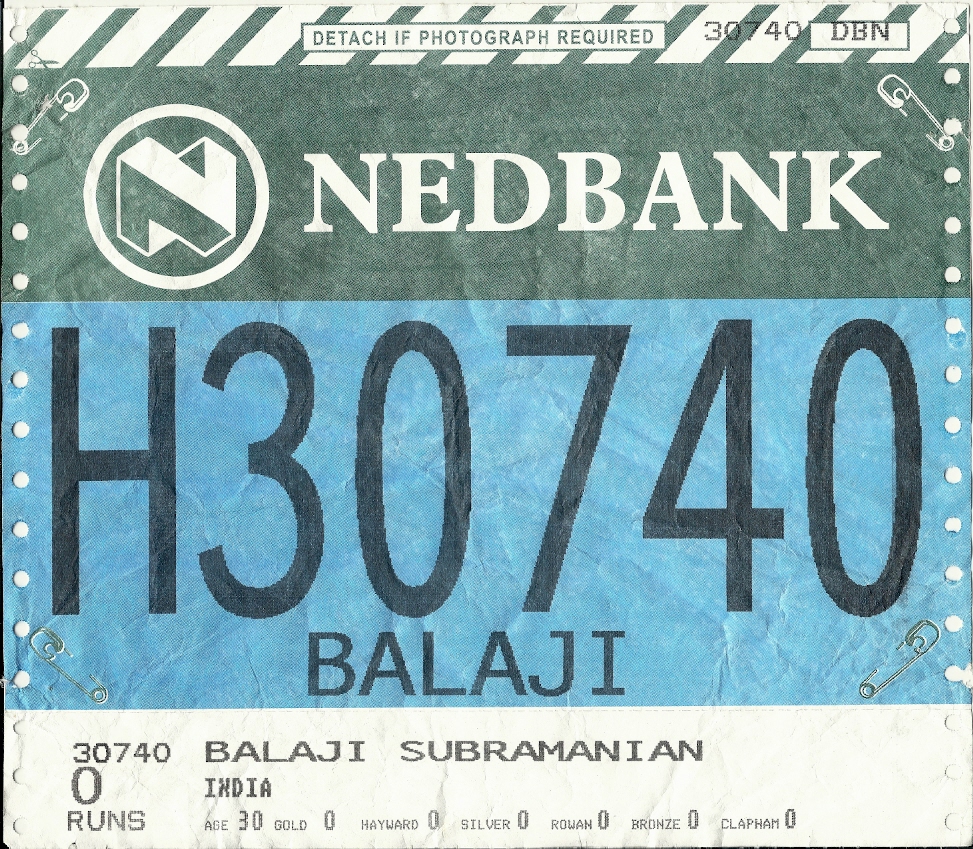 Unable to get a good qualifying timing, I ended up using my Hyderabad Marathon timing for qualification and could start only with the ‘Janata class’ or Batch H. Ram with his better timing at Hyderabad started with Batch F. Lower seeding puts you in back of the pack and hence, a delayed start. The cut-off for Comrades marathon goes by gun timing. Starting at ‘H’ meant that the 10 minutes I took to reach the start line after the start gun was fired would not be adjusted in my final time or in the cut-off times. The good thing about starting with ‘H’ batch is that you would be starting with a similar set of inexperienced, first time comrade runners with no one exactly knowing what they are heading for. In Comrades, two sets of Bibs are given and have to be pinned both front and back. It contains details of runners including the number of medals won by them.