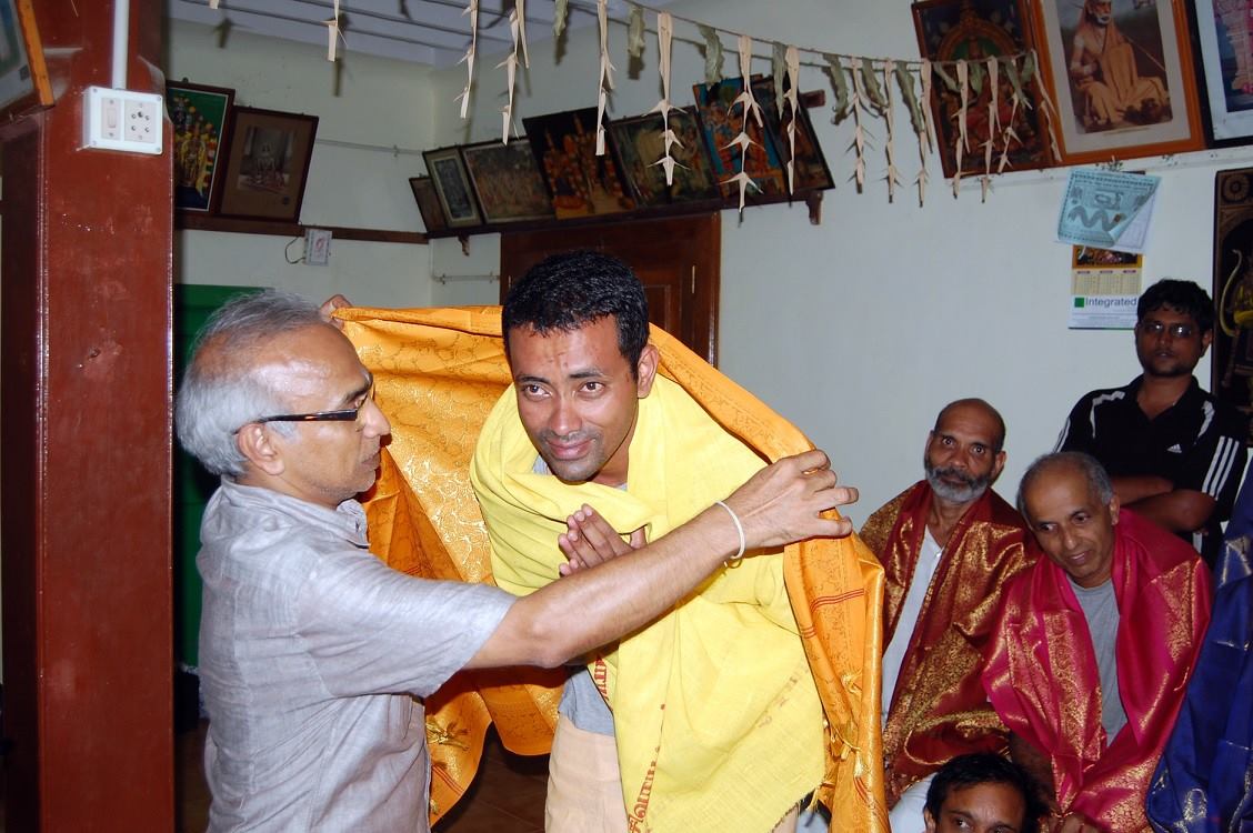 The ‘Official clothing’ for the event was soon unveiled – A handloom Veshti or veatti and a thundu. I prefer to use the Tamil words as the English equivalents fail to convince me of their purpose they are designed for. Dhoti (with origins in Hindi) is too generic and thanks to Bollywood, today most do not know the difference between Veshti and Lungi. Thundu, translated as towel, would imply that it is a piece of cloth used to dry oneself. The purpose of these two garments far exceed the actual purpose they were designed for. It was during this trip that I found the multivariate utility of Veshti and Thundu.ย Apart from being a quick-fix solution for decent piece of clothing, it also served as a bed spread, for protection against mosquitoes, heat and various others. It took very less changeover time to transition our appearance from a runner to a ‘spiritual aspirant.’ It was also a welcome change to see these kits instead of the usual T-shirts which I have accumulated over many running events in the past 4-5 years.