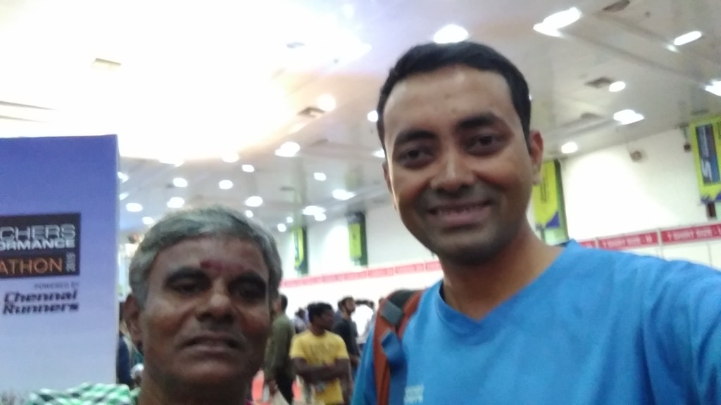 In 2013, he appeared at the Chennai marathon expo. He did not register for the event as registrations for the event was only through website. I saw from far that he was hassling with Shahid, the race director, for an entry to the event. I met Shahid seperately, took the liberty to ask for an entry for him and pulled out my wallet to pay for it. On learning his case, he was kind to offer it for free. When I walked up to him and handed over the bib, he was elated but refused to accept it for free. He insisted that he pays for the event (which was quite pricey!) and thrusted the notes in my hand. Doing charitable acts cannot be always taken for granted!