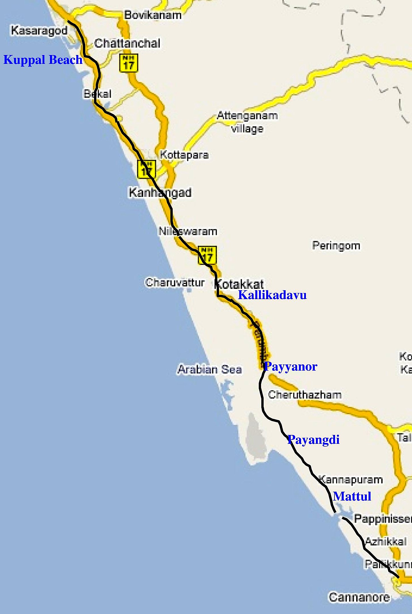 Kannur – Azhikkode – Mattul – Payangadi – Payannur – Kalikkadavu – Charuvathur – Nileshwaram – Bekal – Kuppal Beach – Melparamu – Kasargod
